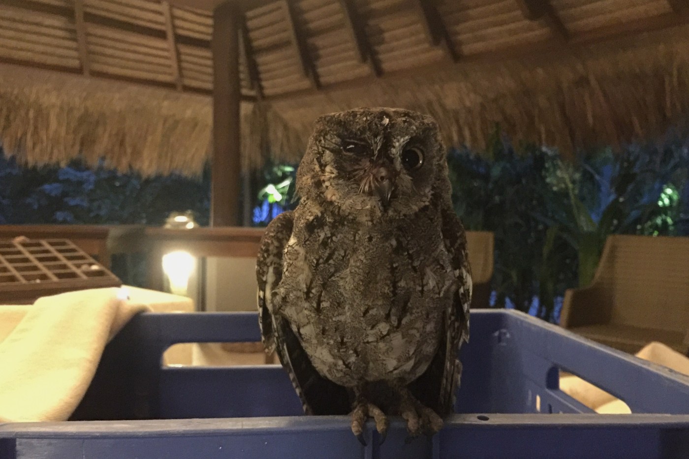 With the advice of a veterinarian, we put it in a crate full of dried leaves and twigs to make it feel comfortable while it rested and regained energy. We also dabbed his eye with diluted betadine, and gave him a bit of sugar water to boost him with energy. We were advised to do a soft release- that is, to leave the crate uncovered so that the owl could fly away once it felt like it could.